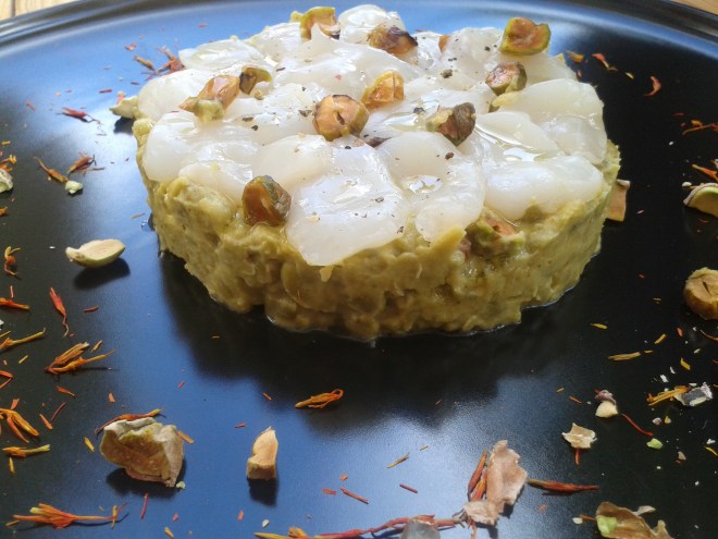 Carpaccio de Saint Jacques et guacamole de petits pois
