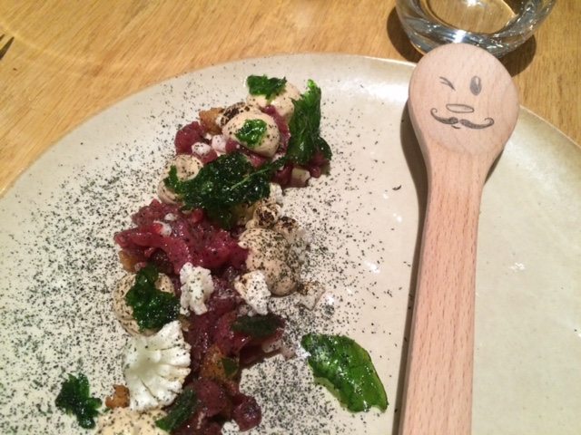 (tartare de chevreuil, pin, lard et choux fleur fumé)