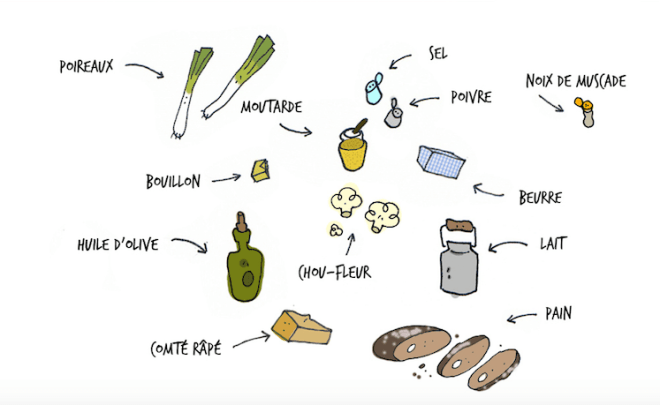 Clafoutis et Gribouillis pour sa carte blanche sur http://sharingcuisine.org a choisit de partager avec nous sa recette de Velouté de poireaux et choux fleur au fromage.