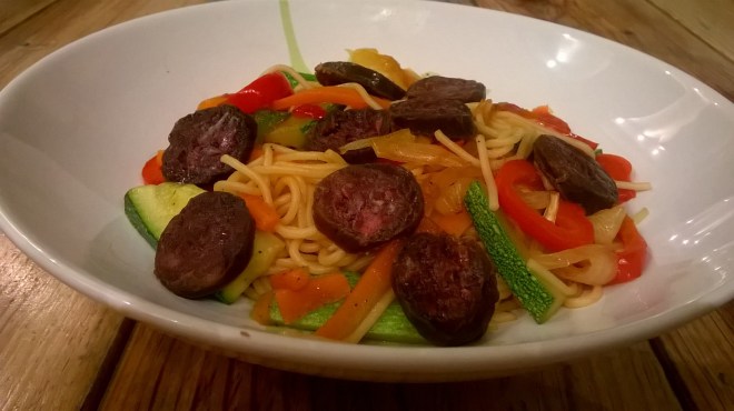 Ajouter les pâtes, puis le figattu. Faire sauter encore 2 minutes en remuant constamment, puis ajouter la sauce barbecue et 2 minutes plus tard…on passe à table 😉