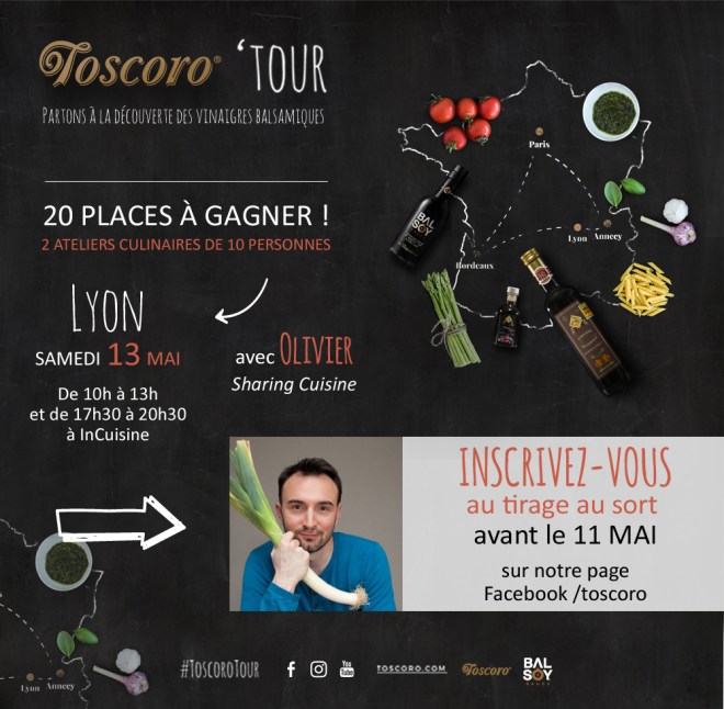 Les vinaigres balsamiques Toscoro vous invite à des ateliers cuisine gratuits à travers la France. 16 ateliers, 80 places sont à gagner réparties en 4 villes étapes (Paris, Lyon, Bordeaux, Annecy)